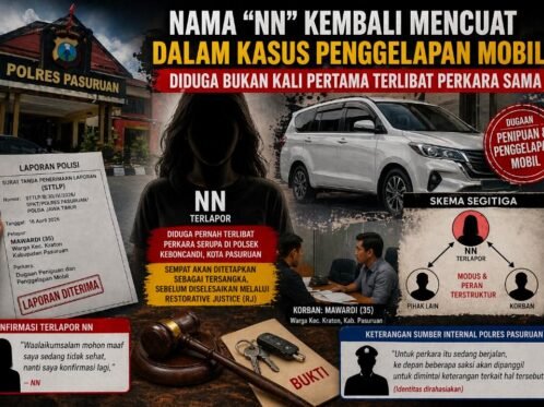 BeritaPASURUAN, Pagiterkini.Com – Penanganan perkara dugaan penipuan dan penggelapan mobil yang saat ini bergulir di Polres Pasuruan mulai mengungkap temuan yang memantik perhatian serius. Salah satu terlapor berinisial NN, perempuan asal Kecamatan Wonorejo, disebut-sebut memiliki rekam jejak keterlibatan dalam perkara serupa dengan modus yang hampir sama. Informasi yang dihimpun awak media menyebutkan, bahwa NN sebelumnya […]